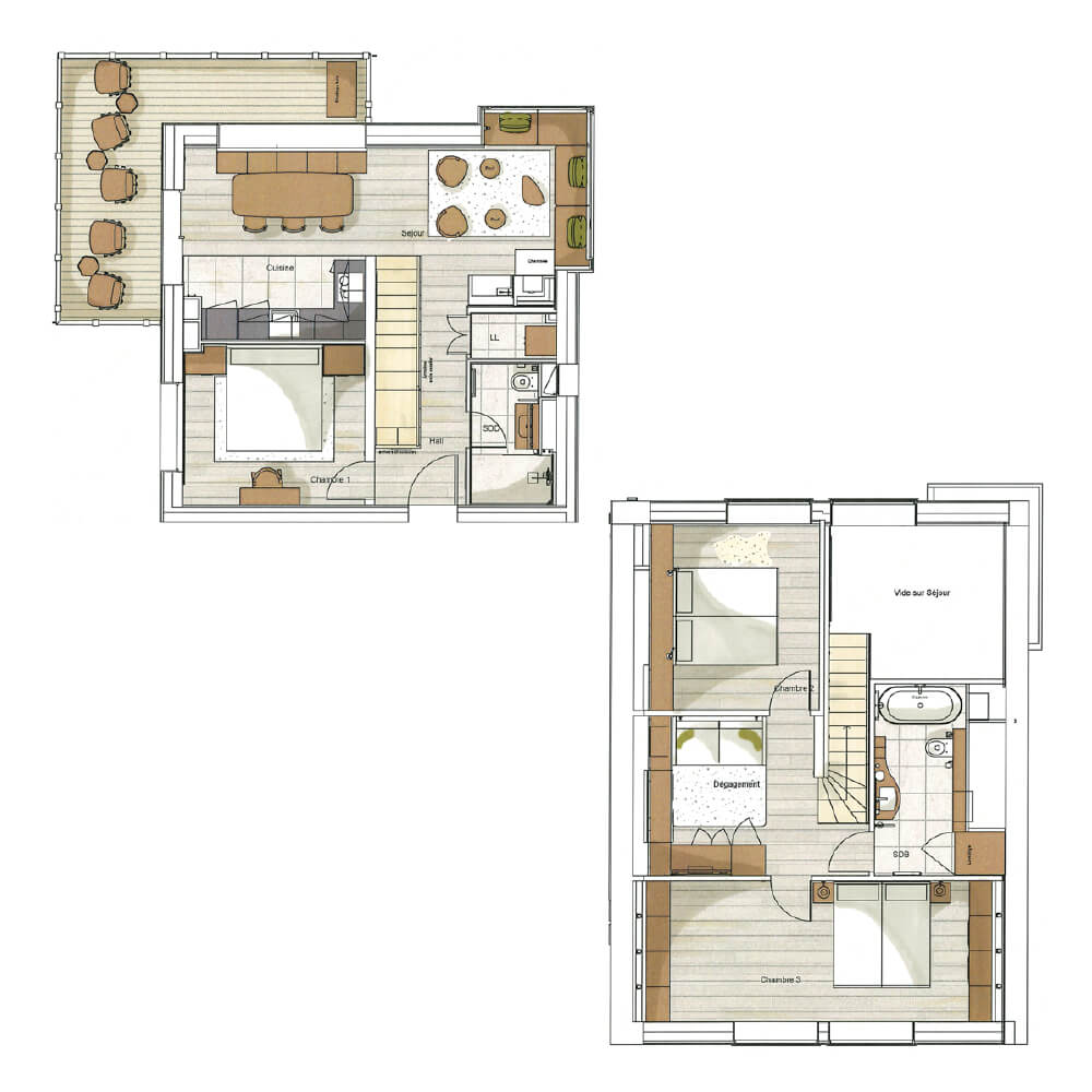 Ce chalet en duplex vous offre deux niveaux de bonheur pour votre séjour à la montagne. Découvrez le plan intérieur de ce chalet pour comprendre son aménagement intérieur et profiter de superbes espaces de vie.