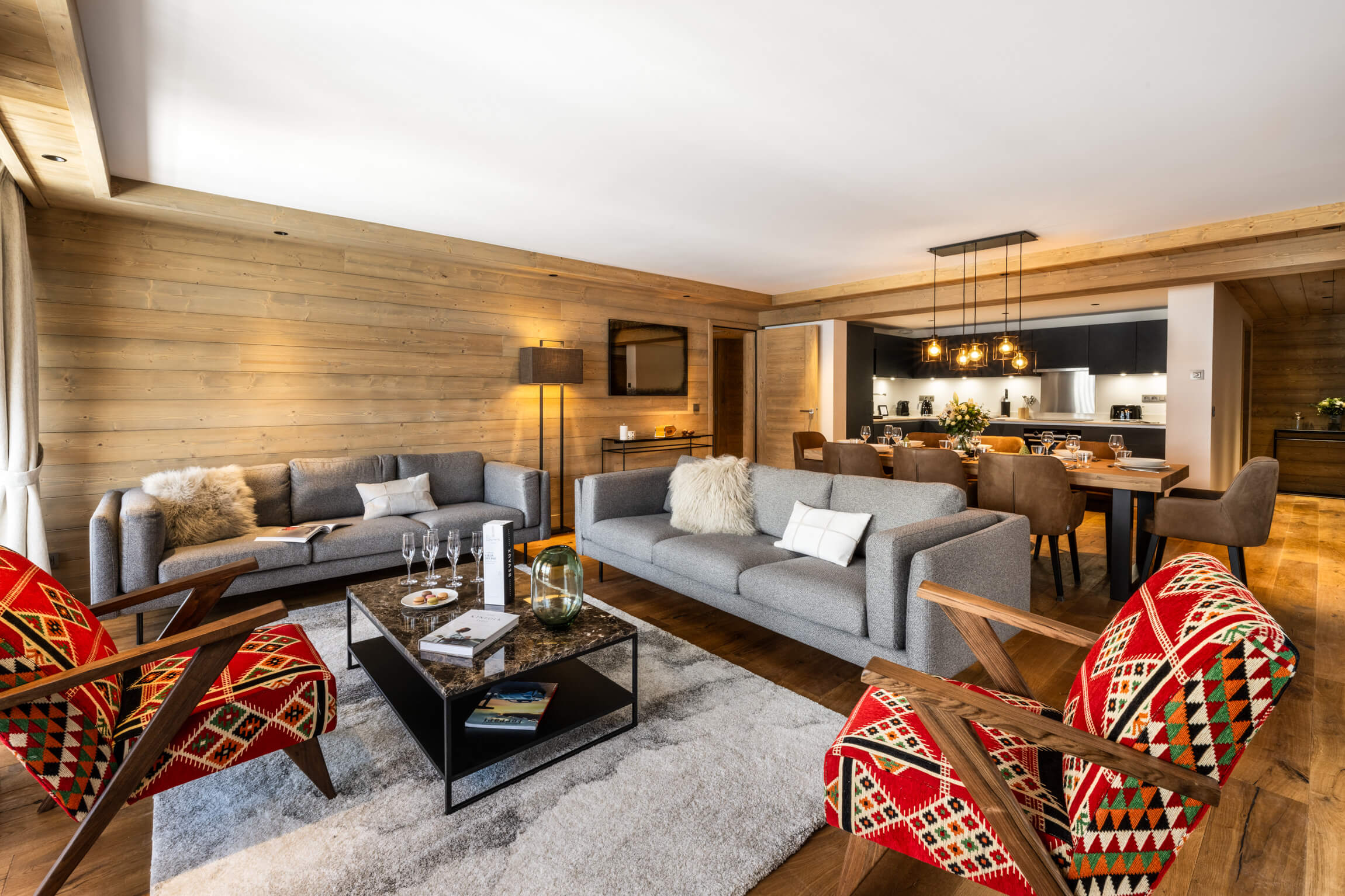 Diese Chalet-Wohnung verfügt über zwei Schlafzimmer mit Doppelbett (180 × 200 cm & 140 × 200 cm) sowie über ein Badezimmer mit Dusche. Der Wohnbereich bietet eine Sitzecke mit Fernseher, eine voll ausgestattete Küche, einen Holzofen und zwei Balkone, darunter ein nach Süden ausgerichteter Balkon. Das Chalet ist nach Süden und Norden ausgerichtet. Zur Ausstattung gehören Haushaltsgeräte wie Geschirrspüler, Nespresso-Kaffeemaschine, notwendige Küchenutensilien usw.