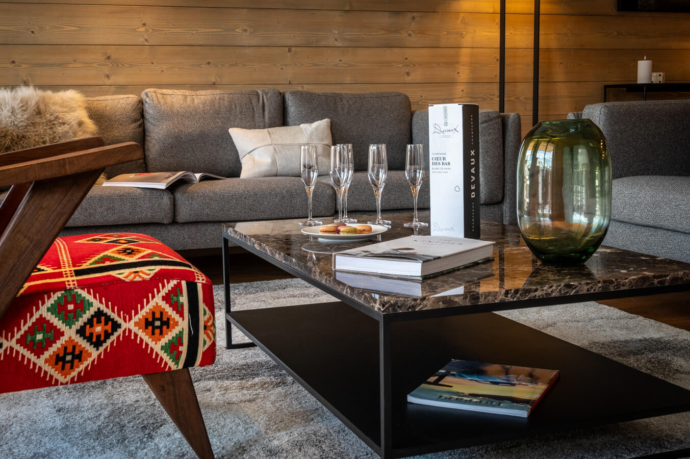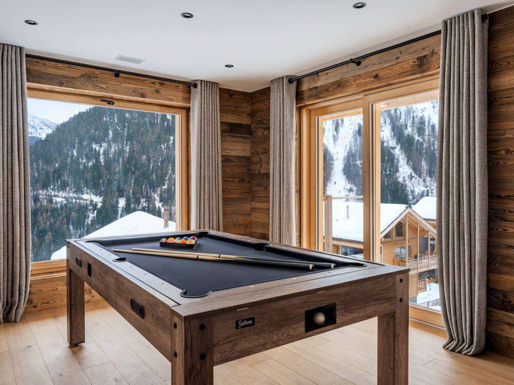 Der Wohnbereich ist mit einer Sitzecke und einem Fernseher ausgestattet und umfasst eine voll ausgestattete Küche sowie einen Kamin. Die Außenbereiche bieten freie Ausblicke auf die umliegenden Gipfel. Besonderheiten: eine Sauna, ein zweites Wohnzimmer als TV-Ecke sowie ein großer Spielraum. Das Chalet ist nach allen Himmelsrichtungen ausgerichtet, wodurch Licht und Ausblick sich im Tagesverlauf immer wieder verändern. Es verfügt über Haushaltsgeräte wie Geschirrspüler, Nespresso-Kaffeemaschine, Küchenutensilien u.v.m.