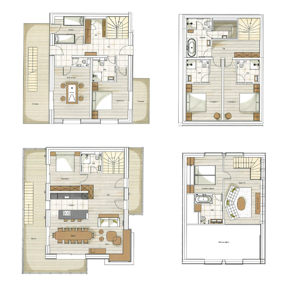 Dieses freistehende Chalet erstreckt sich über vier Ebenen und verfügt über zwei Schlafzimmer mit Doppelbett (180 × 210 cm), zwei fensterlose Schlafzimmer mit Doppelbett (180 × 210 cm) sowie ein Schlafzimmer mit zwei Etagenbetten. Zusätzlich bietet es sechs en-suite Badezimmer mit Dusche und zwei Badewannen.
