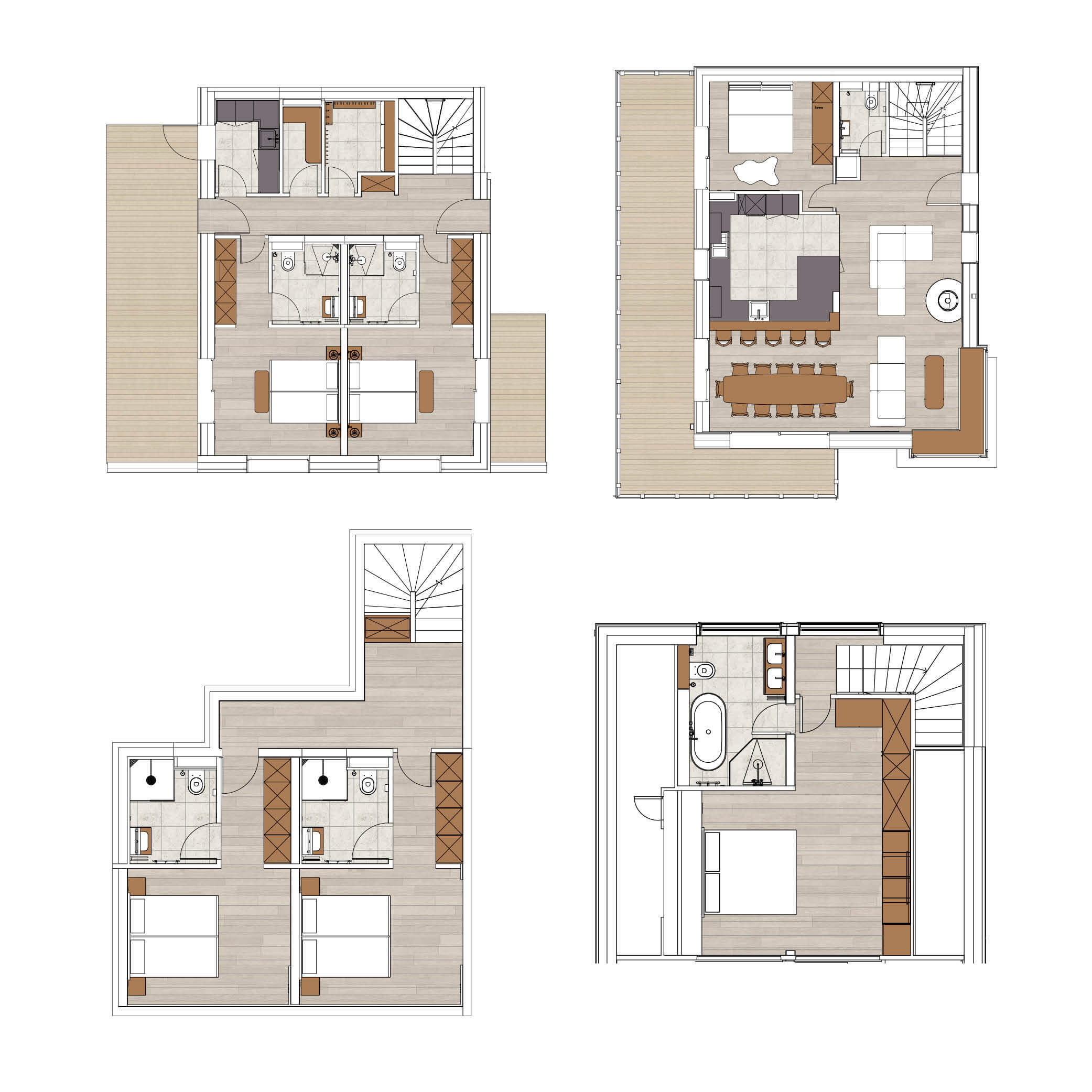 Dieses individuelle Chalet auf vier Ebenen verfügt über fünf Schlafzimmer (davon zwei ohne Fenster) mit King-Size-Betten (180×200), alle mit eigenem Bad, sowie über einen Raum, der als TV-Lounge dient und mit einem ausziehbaren Schlafsofa in ein Doppelzimmer umgewandelt werden kann. Der Wohnbereich bietet eine Sitzecke mit Fernseher, eine komplett ausgestattete Küche, einen Esstisch für 12 Personen, einen Holzofen und Außenbereiche mit atemberaubendem Blick auf die umliegenden Gipfel. Zusätzlich: eine private Sauna zum Entspannen nach einem erlebnisreichen Skitag. Dieses Chalet ist nach Süden, Osten und Norden ausgerichtet und bietet so wechselndes Licht und Ausblicke im Tagesverlauf. Es ist mit Haushaltsgeräten wie Waschmaschine und Trockner, Geschirrspüler, Nespresso-Maschine, Küchenutensilien usw. ausgestattet.